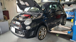 TRUCCO Today! ABARTH595 fukushima 2025年10月30日 エンジンオイル定期交換でご来店の595、今回はフィルターも交換します。 ※オイル交換2回に一度はフィルターも同時に交換ですね。