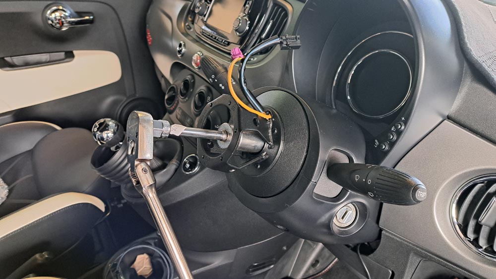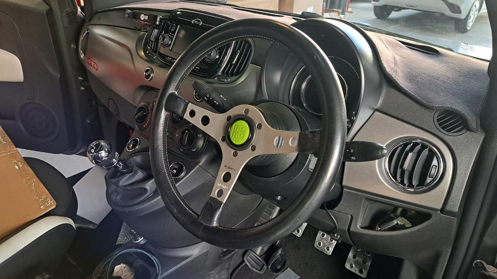 TRUCCO Today! ステアリング交換 fukushima 2025年11月8日 FIAT500ステアリング交換&アルミペダル装着作業完了。 フロントトー&ステアリングセンター調整を行いテストランに向かいます。