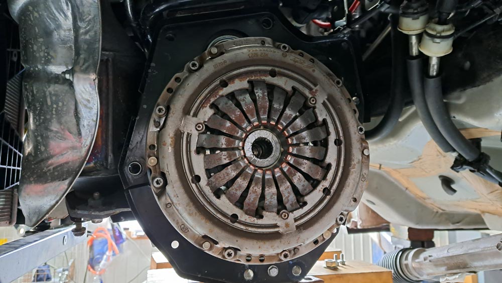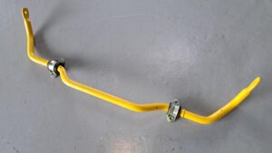 TRUCCO Today! ABARTH595 fukushima 2025年11月27日 ライトウエイトフライホイールキット装着完了の595。 フロントロワアーム(強化ブッシュ組込み)も新調し 強化スタビライザーも装着、作業は車高設定/アライメントに移ります。