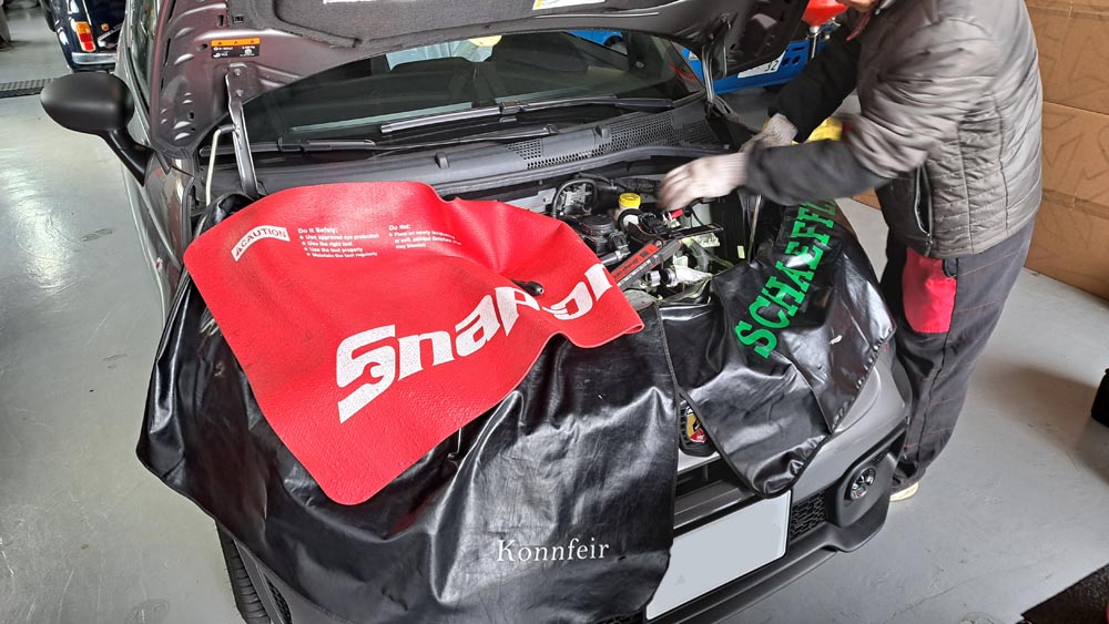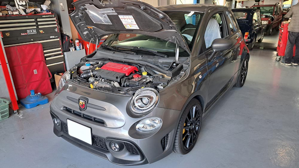 TRUCCO Today! ABARTH595 fukushima 2025年12月2日 スロットルスペーサーやスロットルコントローラーIO PEDAL装着、 ドライバーズシートのローポジション化作業で入庫です。