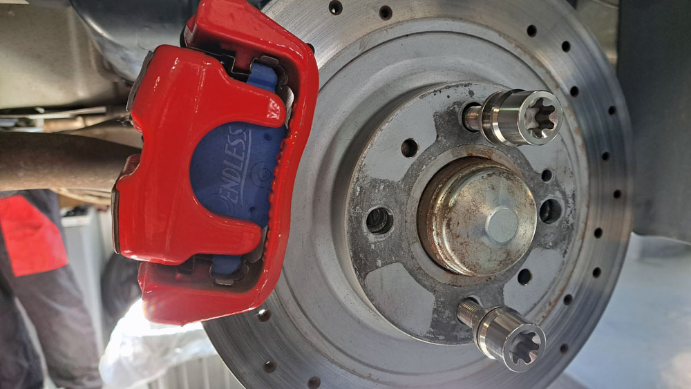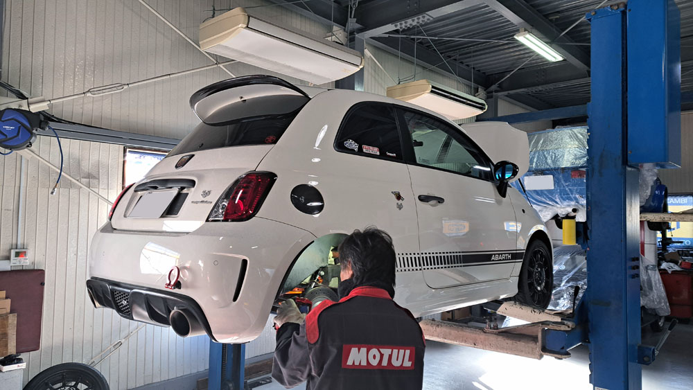 TRUCCO Today! BREMBO fukushima 2025年12月16日 ABARTH595はフロントブレーキローター&パッド交換作業です。 フロントフローティングディスクにパッドは前後共にエンドレスMX72を装着。 (リアは既にビッグローターキットへ交換済です)