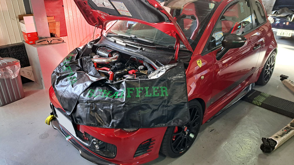 TRUCCO Today! ABARTH595 fukushima 2026年1月6日 年明け最初に入庫頂いたABARTH595。 各部の点検/油脂類交換や スロットルコントローラーIO PEDAL装着他を行います。