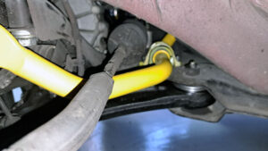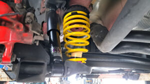 TRUCCO Today! ABARTH595 fukushima 2026年2月3日 足回りリフレッシュ作業、今週も進めています。 フロントロワアーム前後ブッシュを強化タイプへ交換し アッパーマウント交換+トップマウントブッシュ装着。 KW V1サスペンション+強化スタビライザー&調整式リンクロッド モーションコントロールビーム前後セットも装着しています。