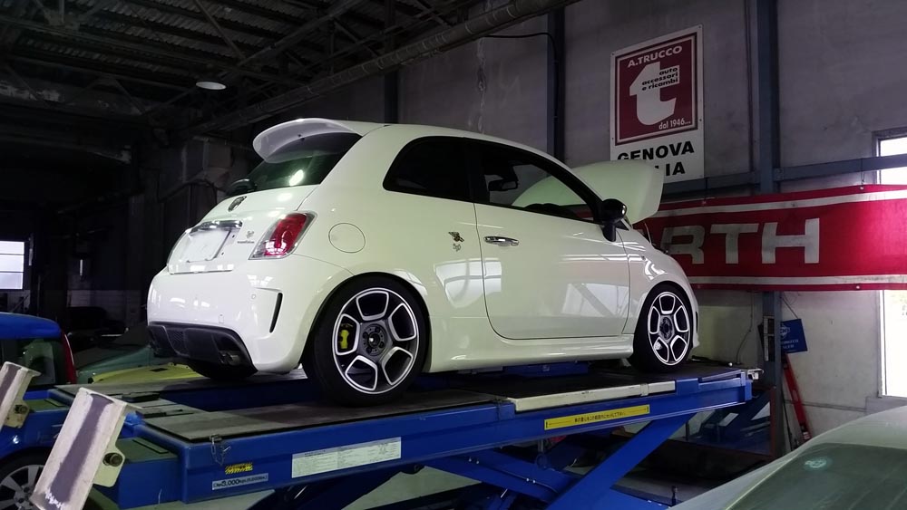 TRUCCO Today! ABARTH595 fukushima 2017年6月15日 エンジンオイル&フィルター交換、 TRUCCOオリジナルsabeltシート用ローポジションシートアダプタ装着でご来店です。