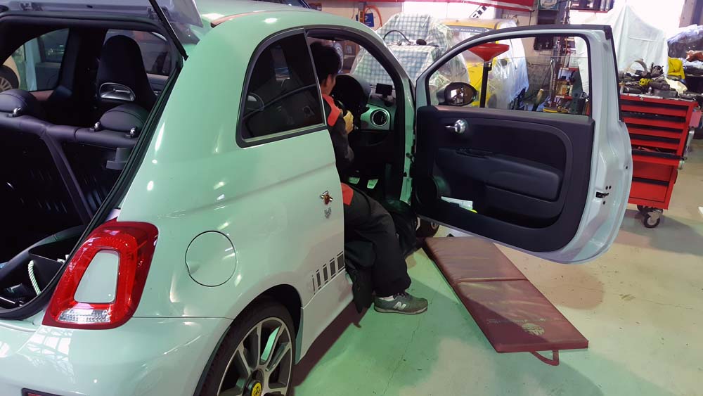 TRUCCO Today! ABARTH595 fukushima 2020年11月28日 ステアリングコラムエクステンダー装着&マフラー交換で入庫。 まずはコラムエクステンダー装着から作業を始めます。