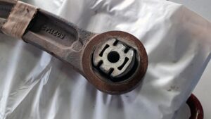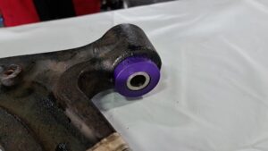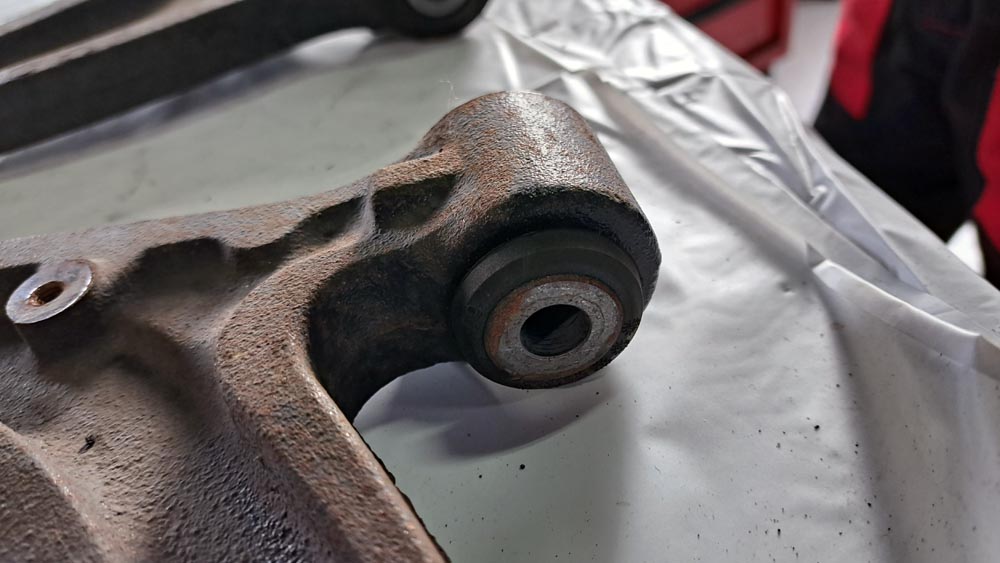 TRUCCO Today! POWER FLEX fukushima 2024年1月9日 595フロントロワアームのブッシュ交換作業完了。 作業はトーションビームを降ろしマウントブッシュ交換へと移ります。