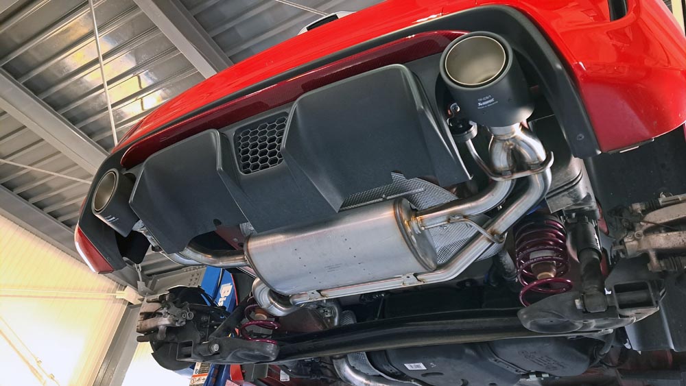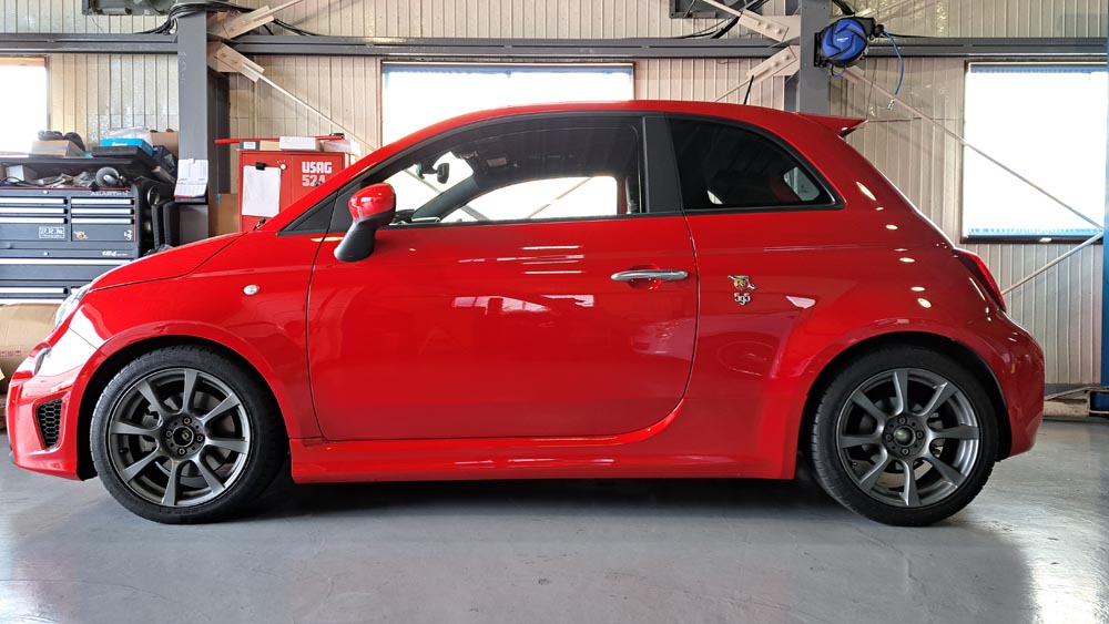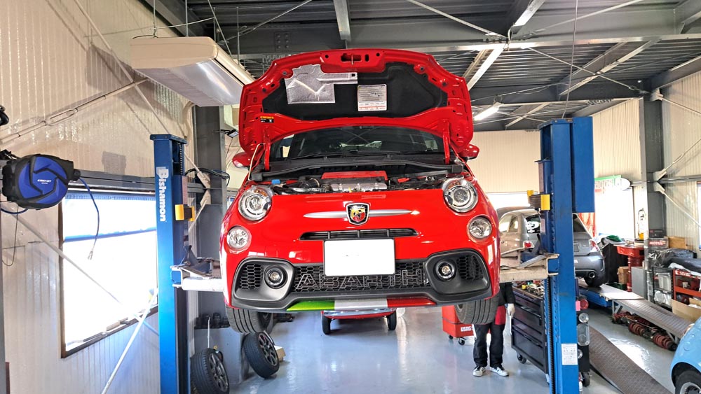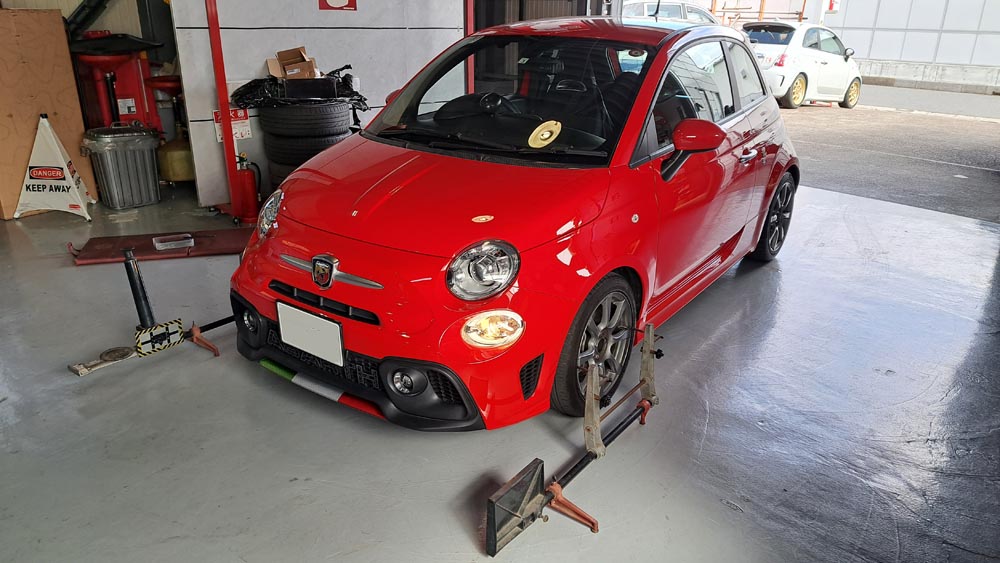 TRUCCO Today! 作業完了 fukushima 2024年3月2日 ABARTH595にVOGTLANDダウンスプリング&アクラポヴィッチマフラー装着完了。 フロントトー&ステアリングセンター調整/テストランを行い納車となります