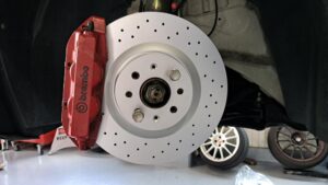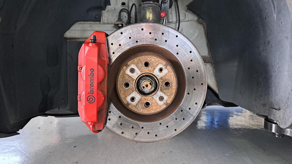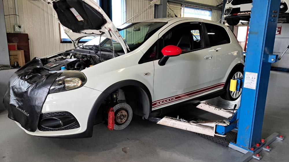 TRUCCO Today! ブレーキローター&パッド交換 fukushima 2024年6月4日 車検のABARTH GRANDE PUNTOも摩耗したフロントローター&パッドを交換。 DIXCELドリルドローター&OZ BP001低ダストパッドの組み合わせです。