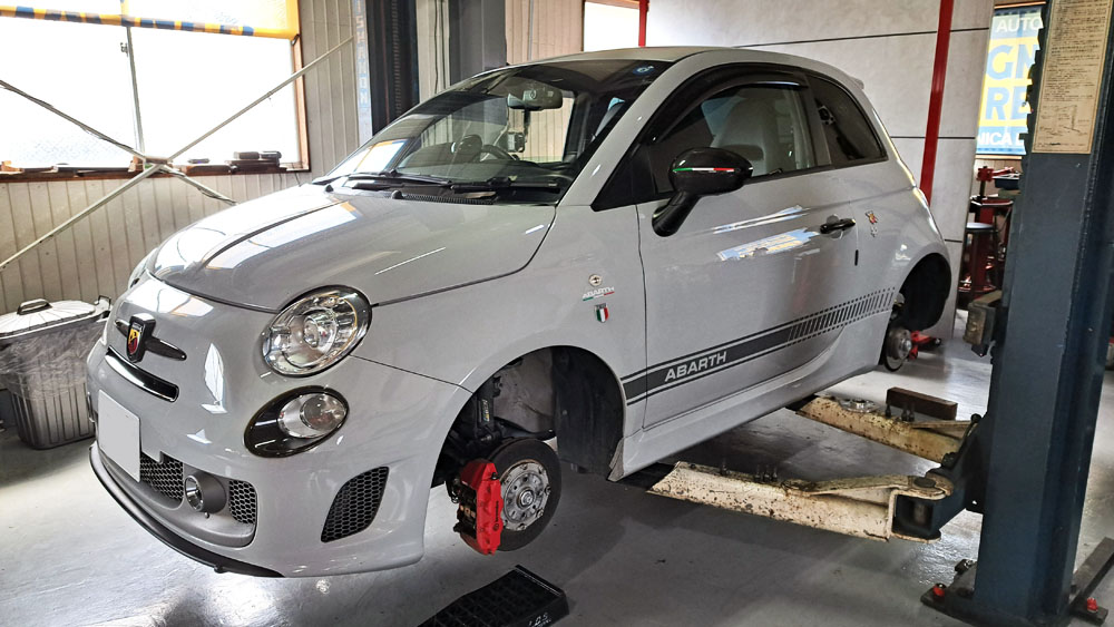 TRUCCO Today! Aragosta TRUCCO special fukushima 2024年9月11日 ABARTH595サスペンション交換作業開始。 リアサブタンク搭載のトゥルッコオリジナルモデルを装着します。