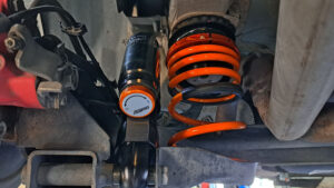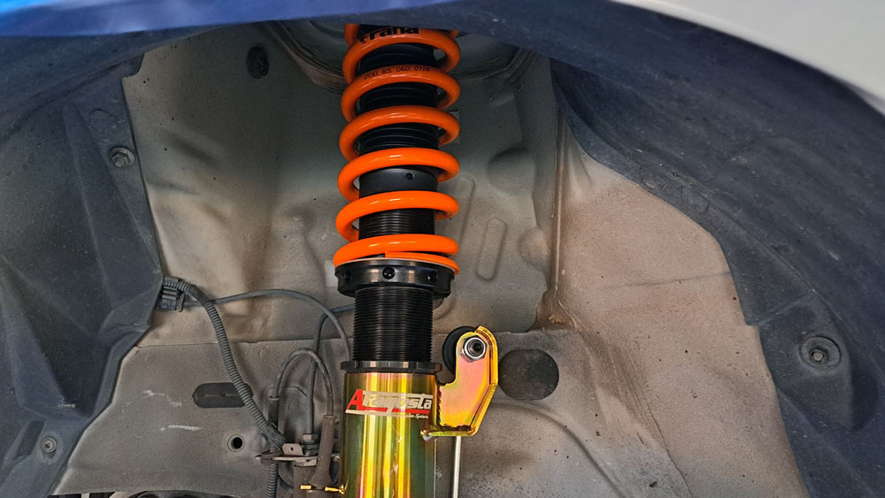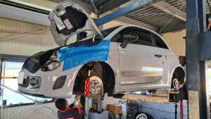 TRUCCO Today! Front Floor Brace fukushima 2024年9月12日 サスペンション交換作業中の595は75performanceフロアブレースも装着。 作業は続きます。