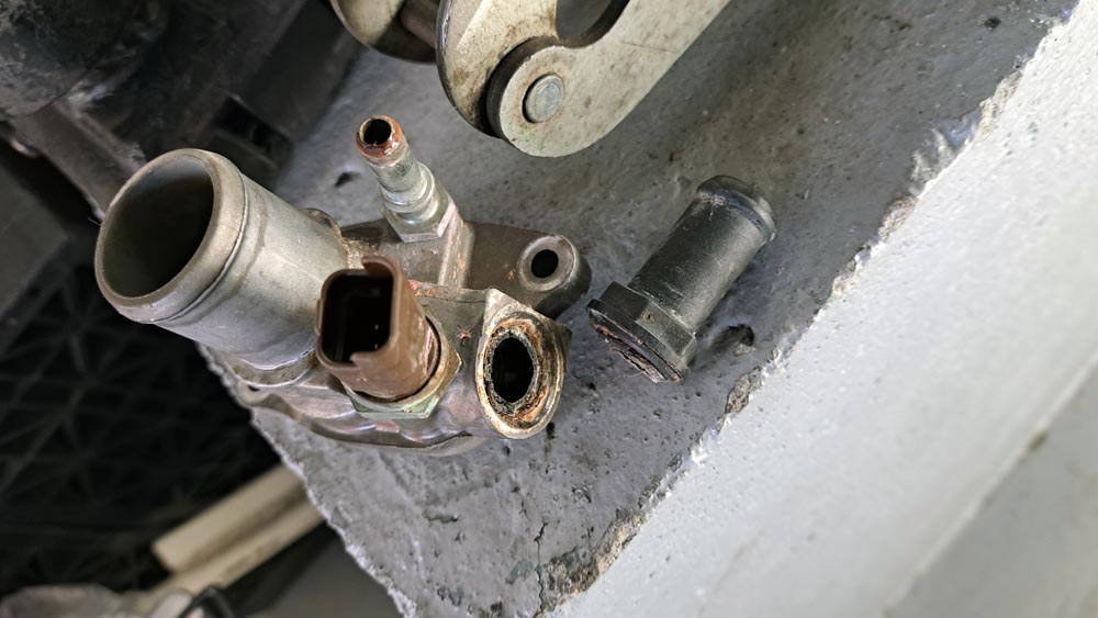 TRUCCO Today! LANCIA Ypsilon fukushima 2024年11月13日 イプシロンは冷却水漏れ修理です。 漏れ位置からサーモスタットが怪しいとチェックしたところ やはりニップル取付部が折れていました。 メタルニップルのサーモスタットを手配します。