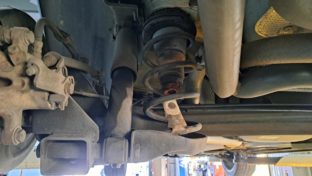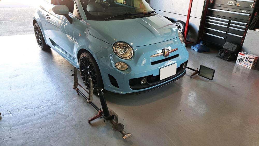 TRUCCO Today! ABARTH500 fukushima 2024年12月19日 ショックアブソーバー交換完了のABARTH500は フロントトー&ステアリングセンター調整を行いテストランに向かいます。