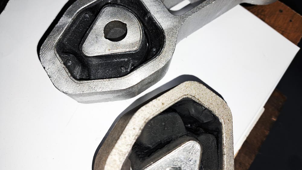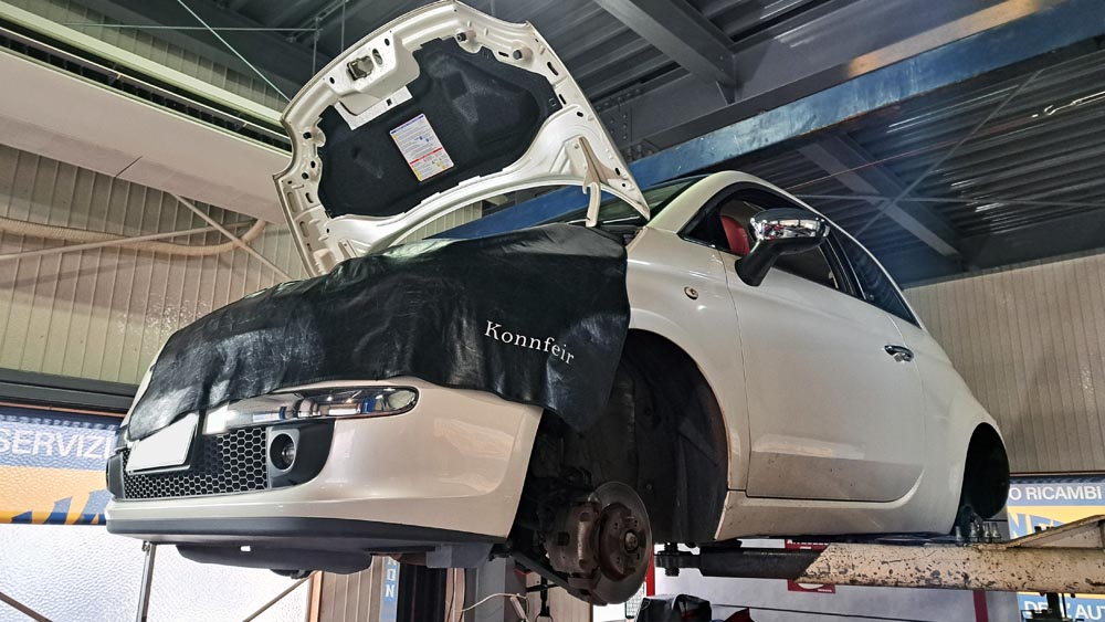 TRUCCO Today! 点検開始 fukushima 2025年3月9日 FIAT500Cツインエアの点検/車検整備開始。 ブッシュが千切れているロワマウントは交換ですね。 (アクセルON/OFF時の異音原因にもなります)
