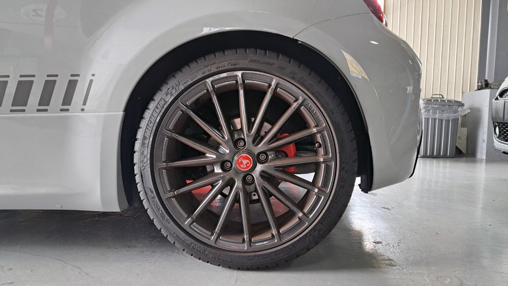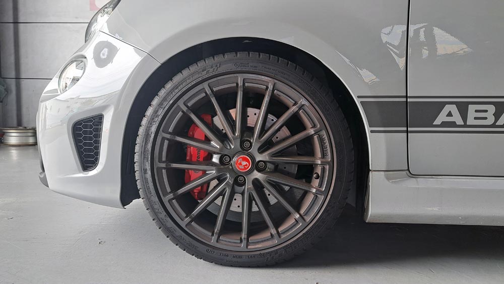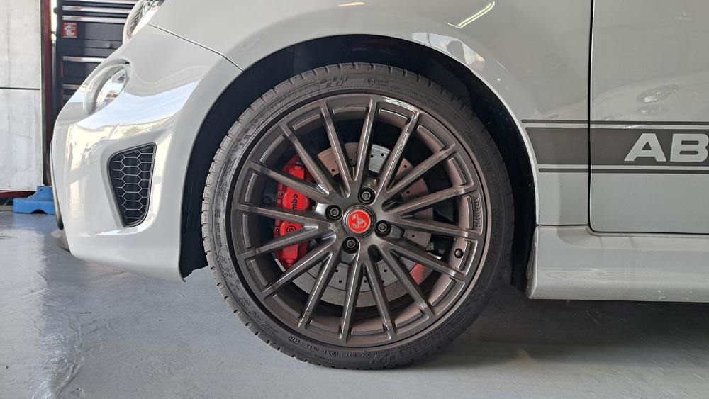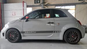 TRUCCO Today! VOGTLAND fukushima 2025年6月12日 ABARTH595にVOGTLANDダウンスプリング装着前後の車高比較画像。 下がり過ぎない程良いダウン量でリアの突き上げ感を抑制する効果もあります。
