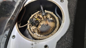 TRUCCO Today! 点検 fukushima 2025年8月24日 FIAT500は燃料漏れの点検です。 リアシート下部のフューエルポンプアッパー部から吹き出している事を確認。 早速パーツを手配します。