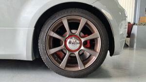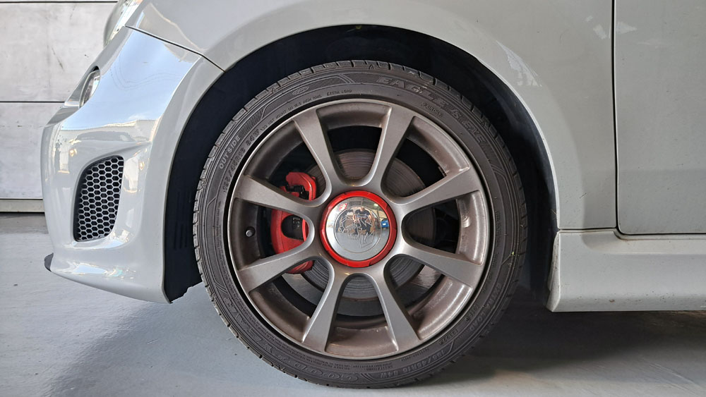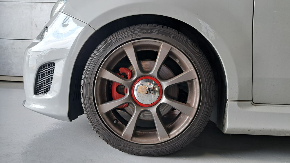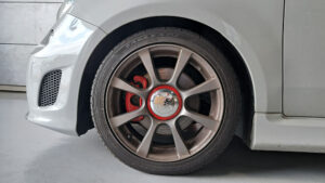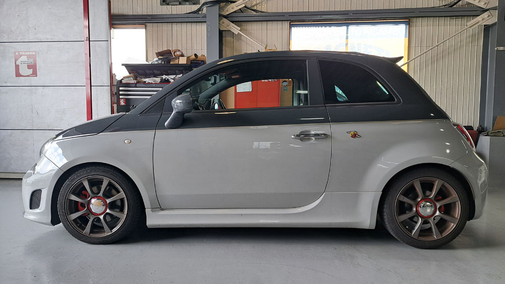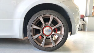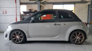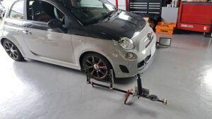 TRUCCO Today! テスト走行へ fukushima 2025年9月9日 スプリング交換で、前後バランスの良い佇まいになったABARTH500Cは フロントトー&ステアリングセンター調整を行いテスト走行に向かいます。