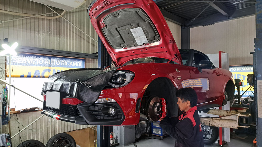 TRUCCO Today! ABARTH124spider fukushima 2025年10月21日 124はブレーキキャリパーのオーバーホールが完了。 ブレーキオイル交換を行い継続検査に向けて作業を進めます。